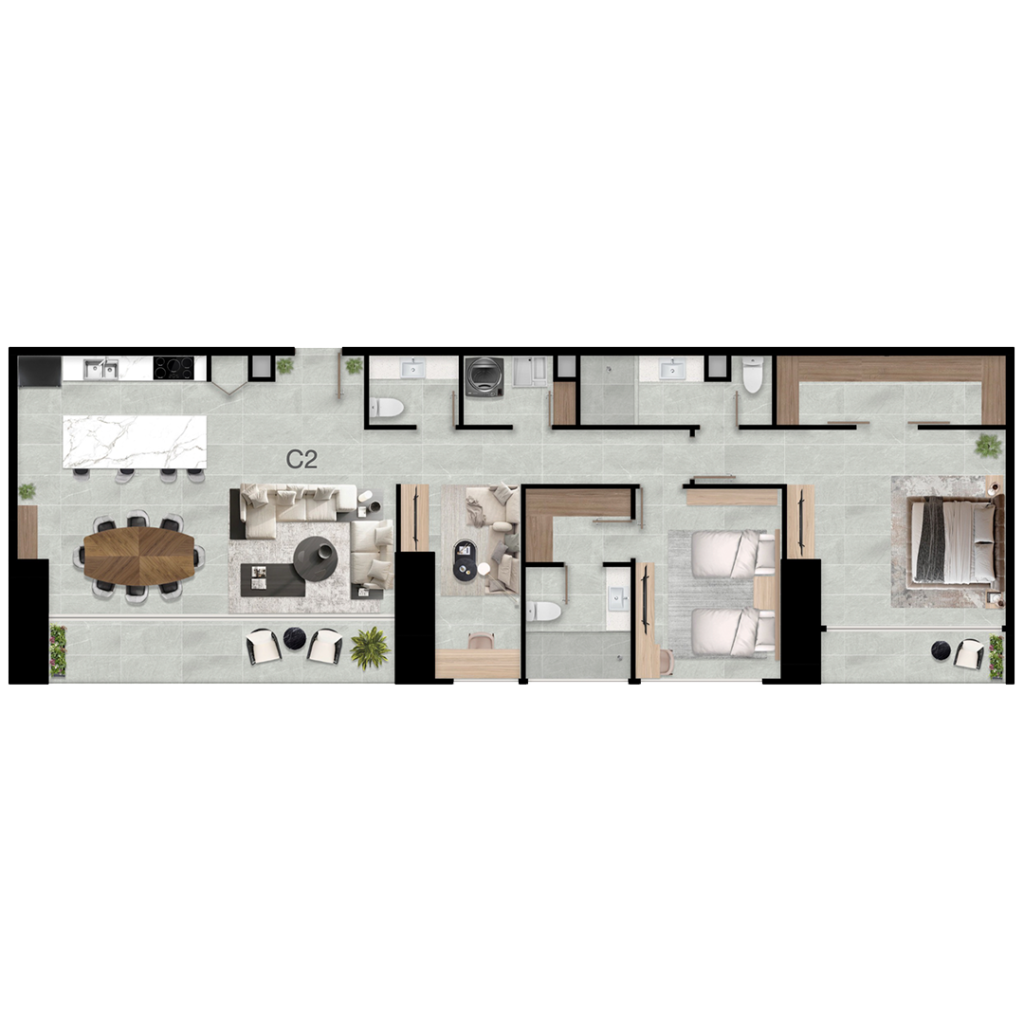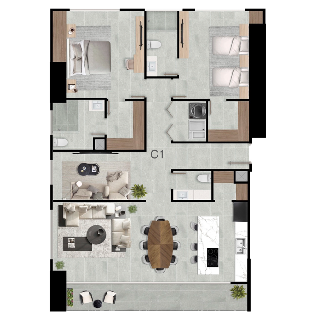 2 Recámaras + 2.5 Baños +Flex + Doble Walk in Clóset +Cocina con isla central + Sala Comedor + Alacena + Cuarto de Lavandería + Doble Balcón
