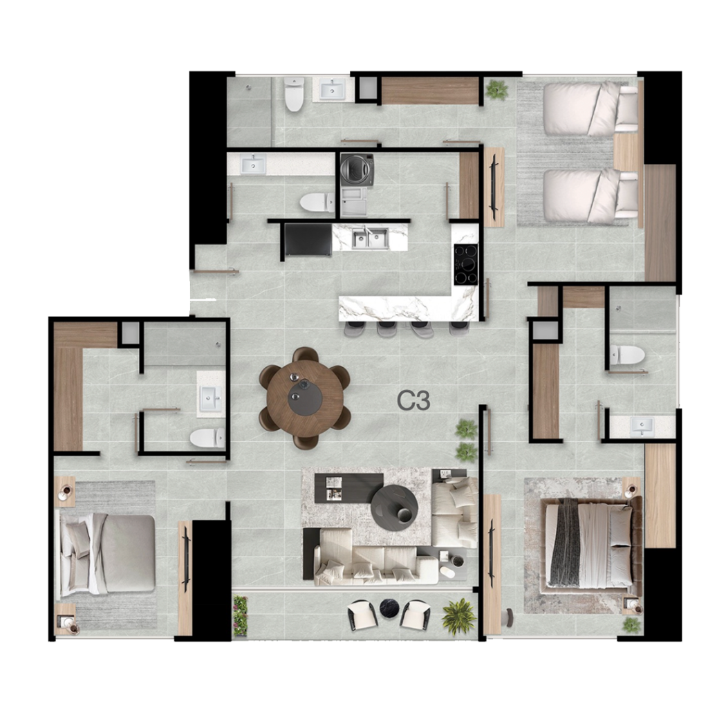 2 Recámaras + 2.5 Baños +Flex + Doble Walk in Clóset +Cocina con isla central + Sala Comedor + Alacena + Lavandería + Balcón